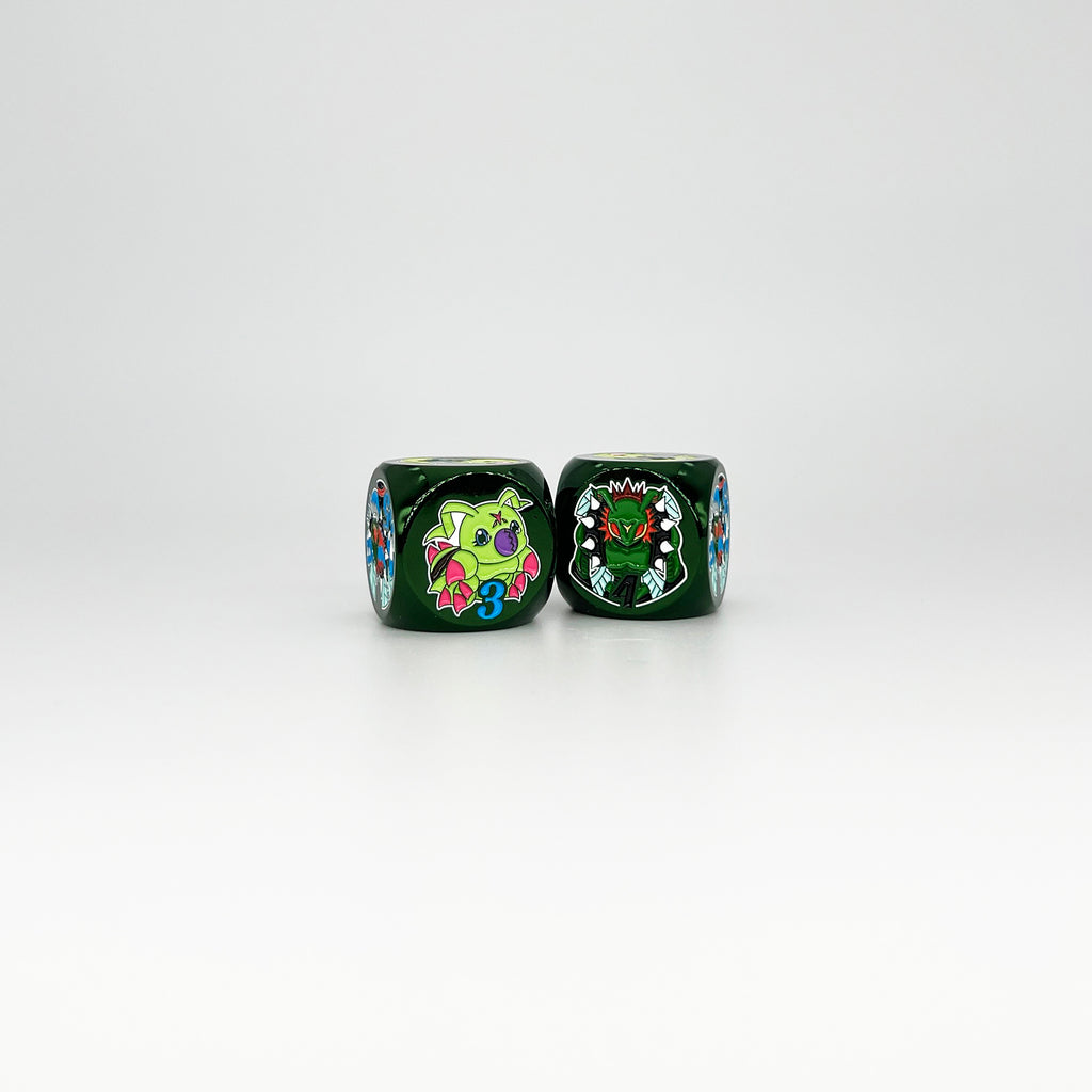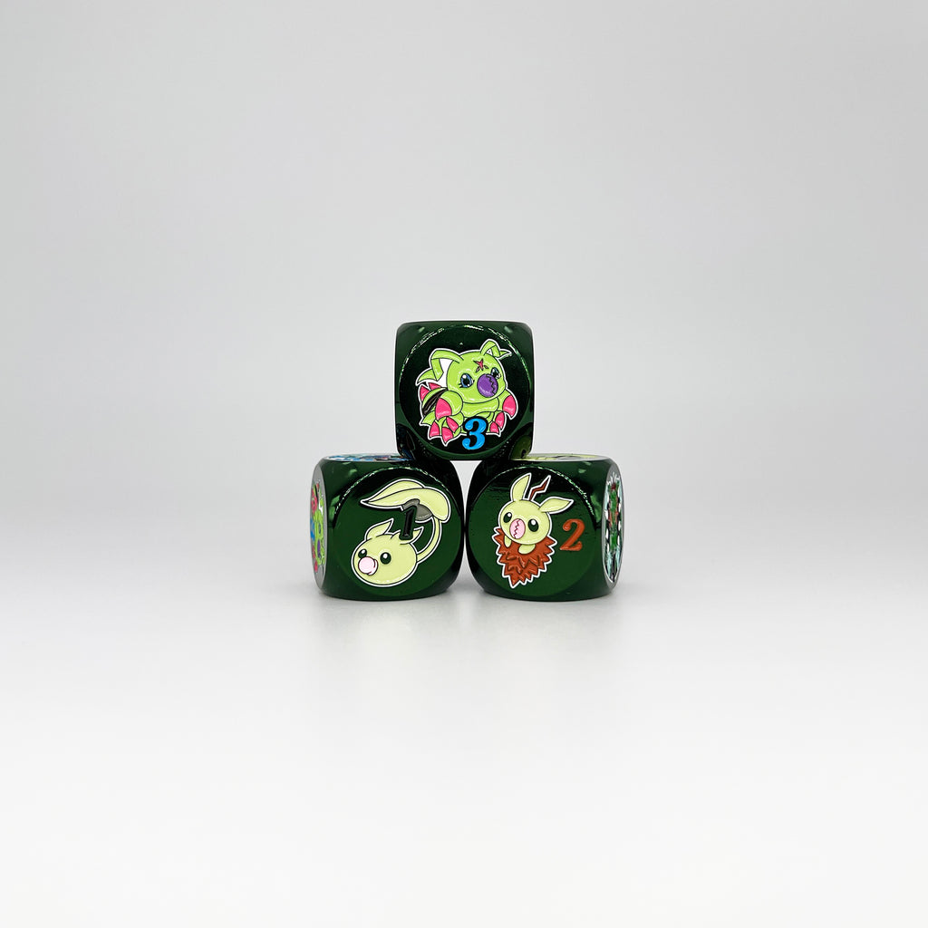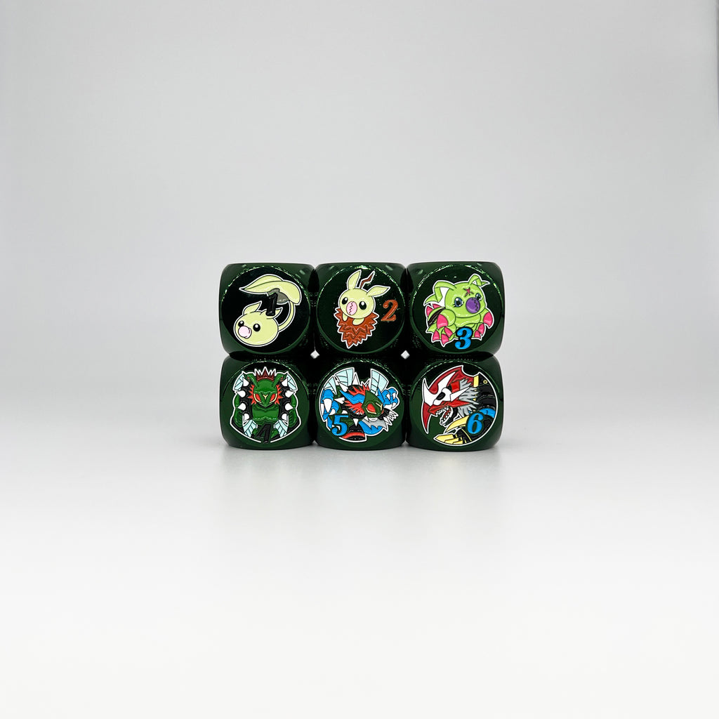 Each metal die measures 22mm and is CNC machine-engraved with anodized metal plating. Metallic green electro-plated base color dice which each sides featuring 6 fully colored Digimons!